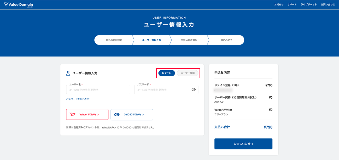 バリュードメインのアカウントをお持ちでない場合は新規登録を、既にお持ちの場合はログインをします。登録は無料で、数分で完了します。