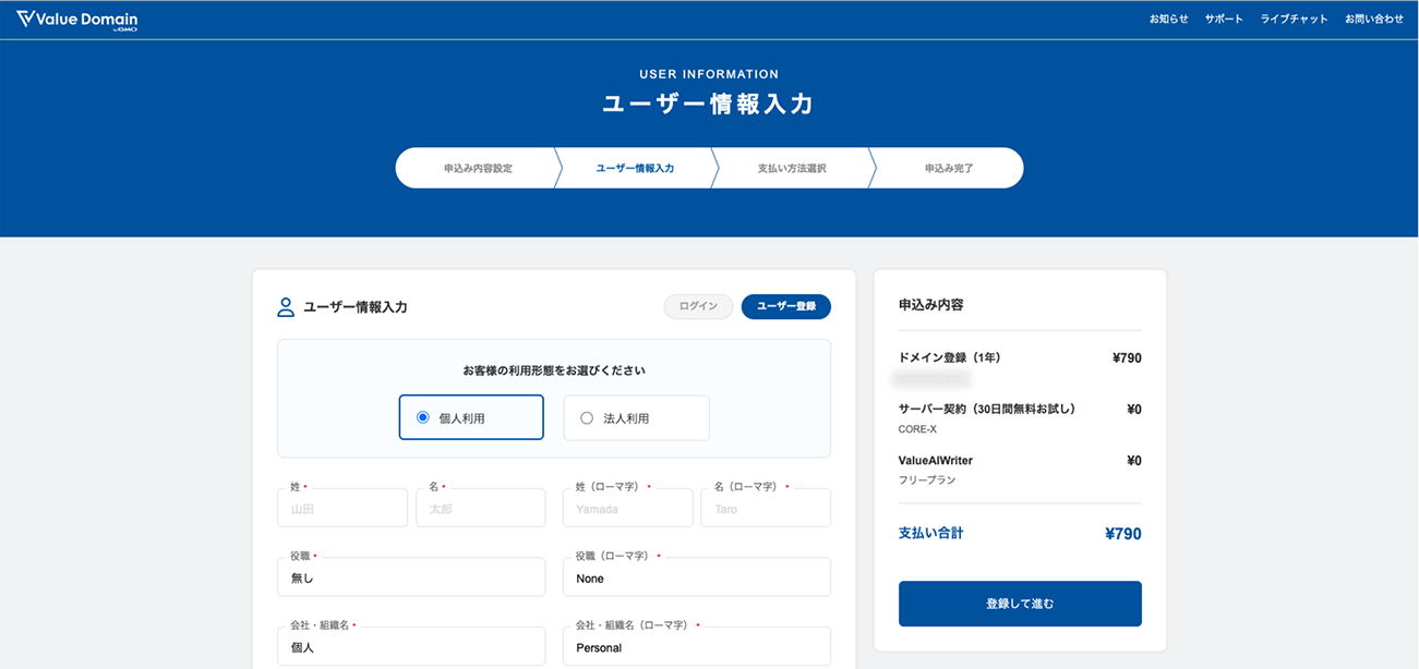 バリュードメインのアカウントをお持ちでない場合はドメインの登録者情報(氏名、住所、連絡先など)を入力します。この情報はWhois情報として登録されます。